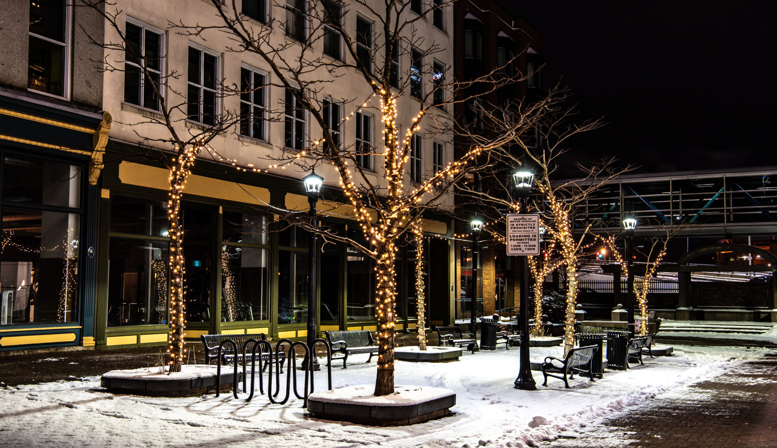 Winter-themed window decals and lights scattered throughout Downtown's streets.