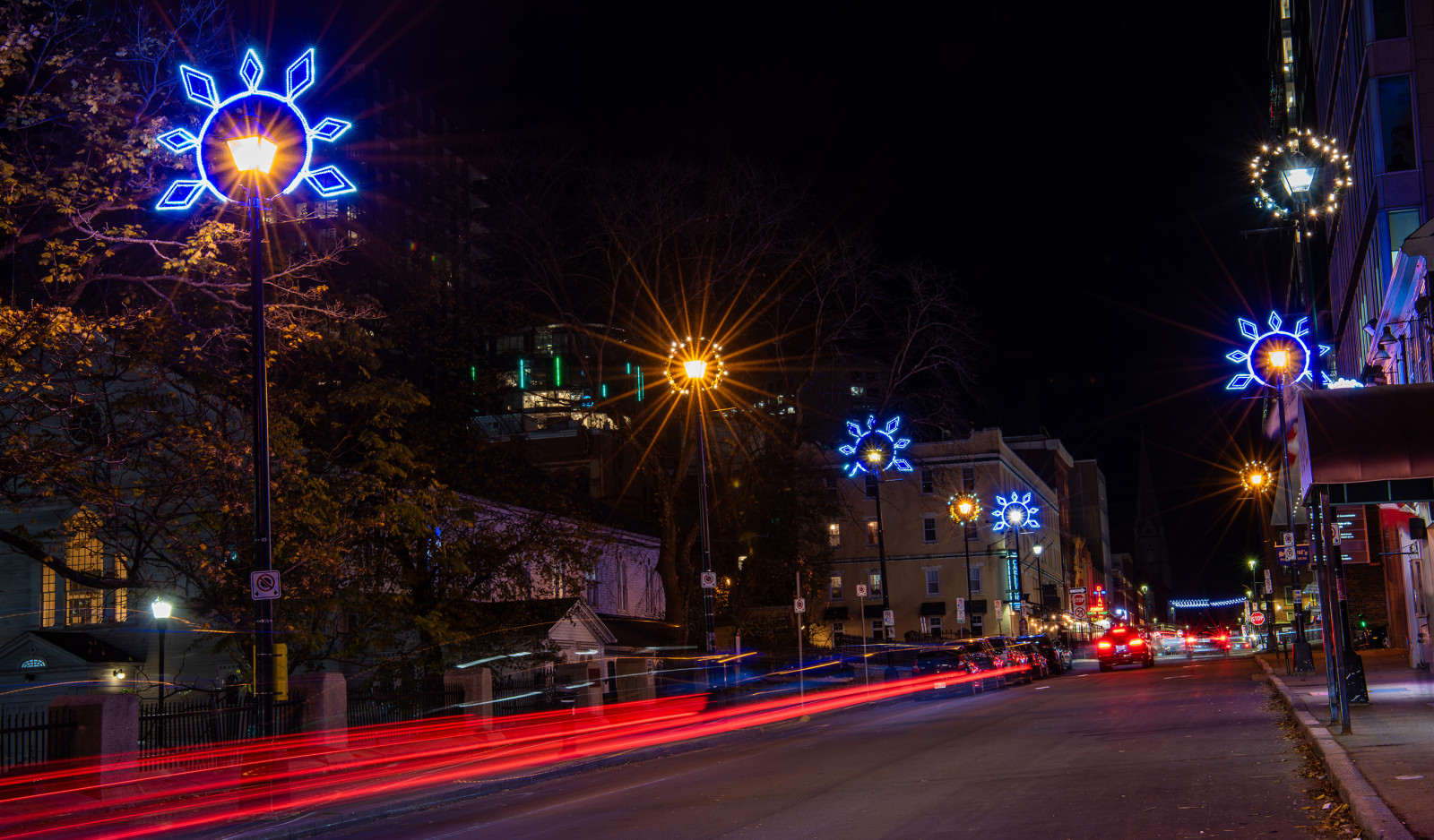 Seasonal light pole displays and tree wrap lights all over Downtown Halifax.