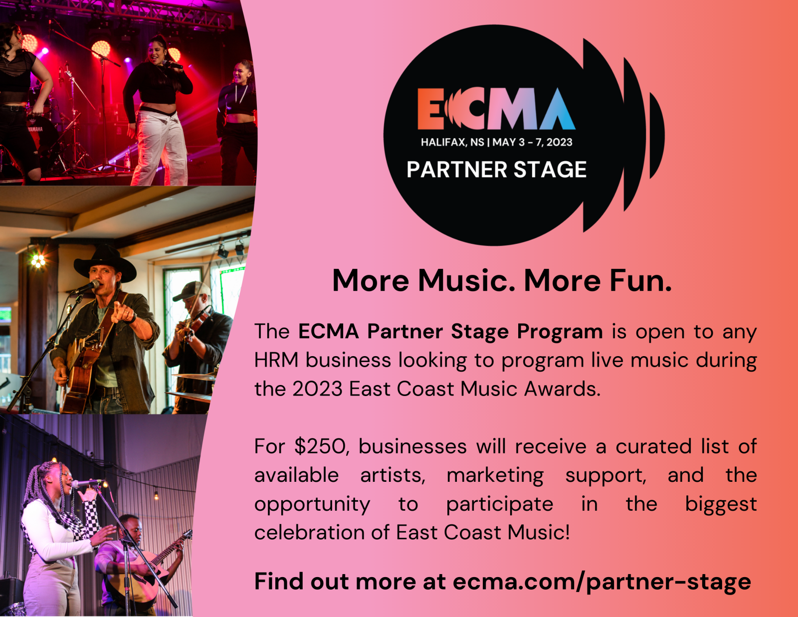 The East Coast Music Awards (ECMA) Partner Stage Grant will subsidize the cost for businesses to become an official 2023 ECMA Partner Stage AND hire an East Coast Music Association member to perform on their stage with a maximum grant of $500.00, excluding tax, per business.