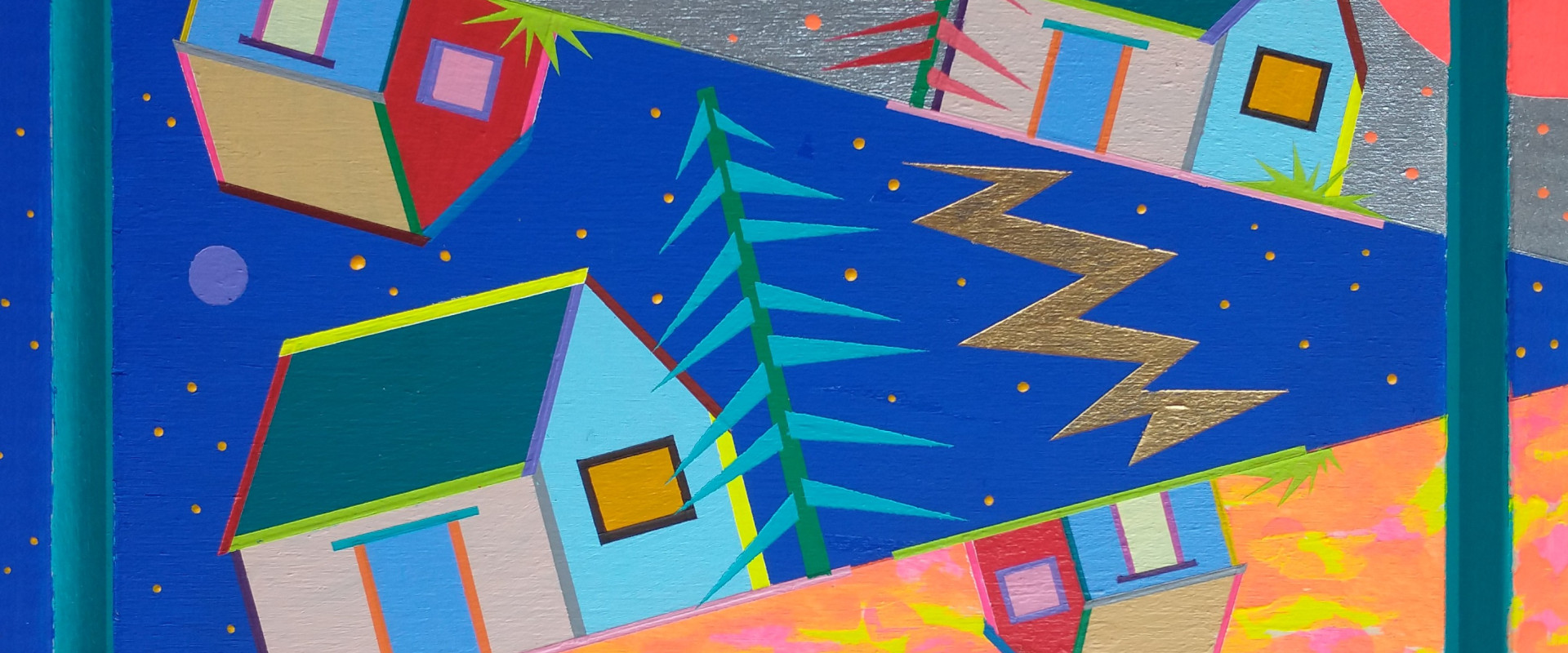 Upside Down & Inside Out plays with the familiar—a house, a tree, a landscape—but bends the rules. These abstract, colorful paintings turn tradition on its head, sometimes quite literally. Homes float, shift, and defy gravity, their bold forms infused with the energy of mid-century modern design and the neon glow of the ‘80s. Some pieces pulse with electric color, while others invite quiet curiosity. And since the works can be flipped, every perspective is the right one.