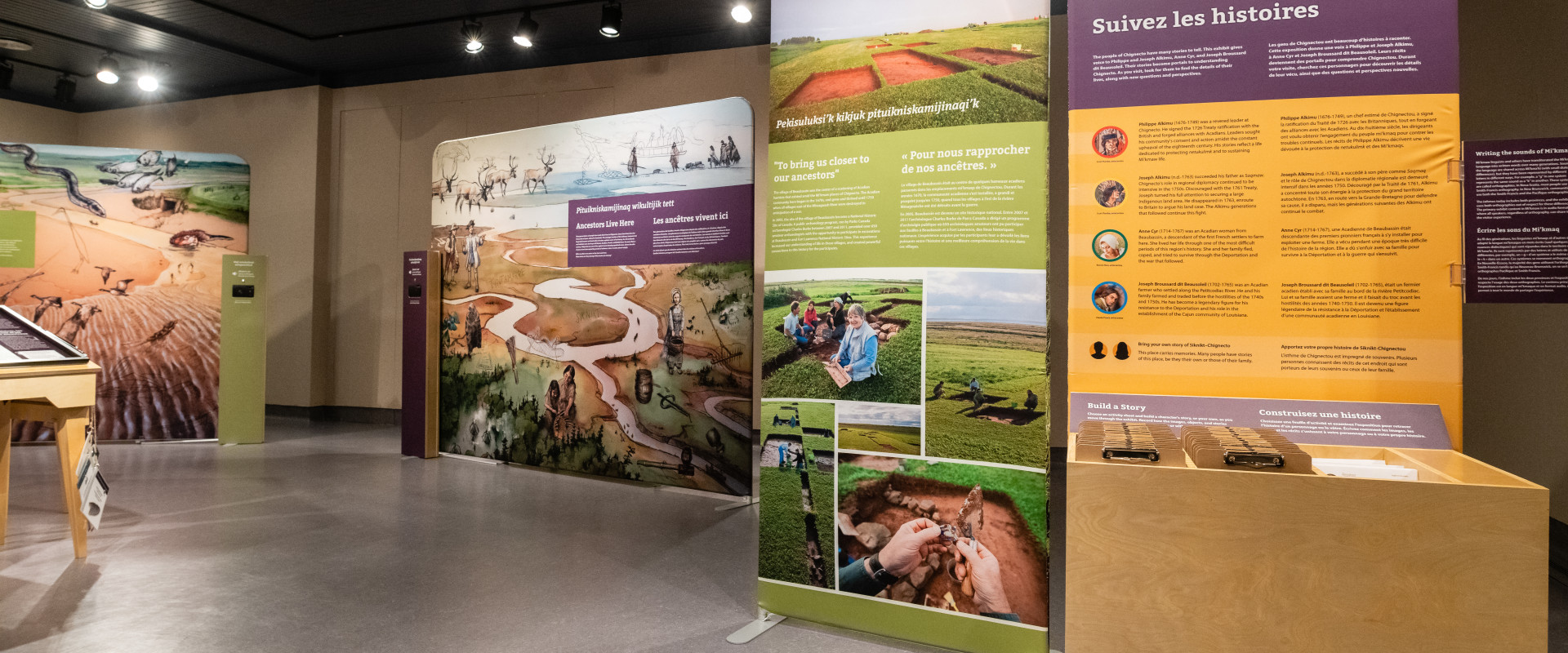 At the entrance of the exhibit, visitors can choose a historic Mi’kmaw or Acadian character with a direct link to the story, who will guide them as they explore the exhibit’s themes. Visitors find clues and statements from their character to help them build a narrative that encompasses the dramatic and tragic events of Chignecto, leading to the deportation of the Acadians and the displacement of the Mi’kmaw community.