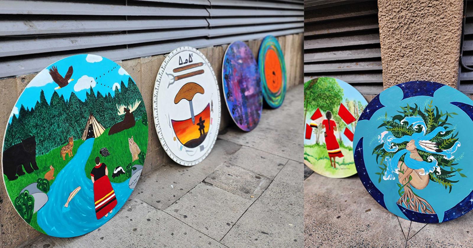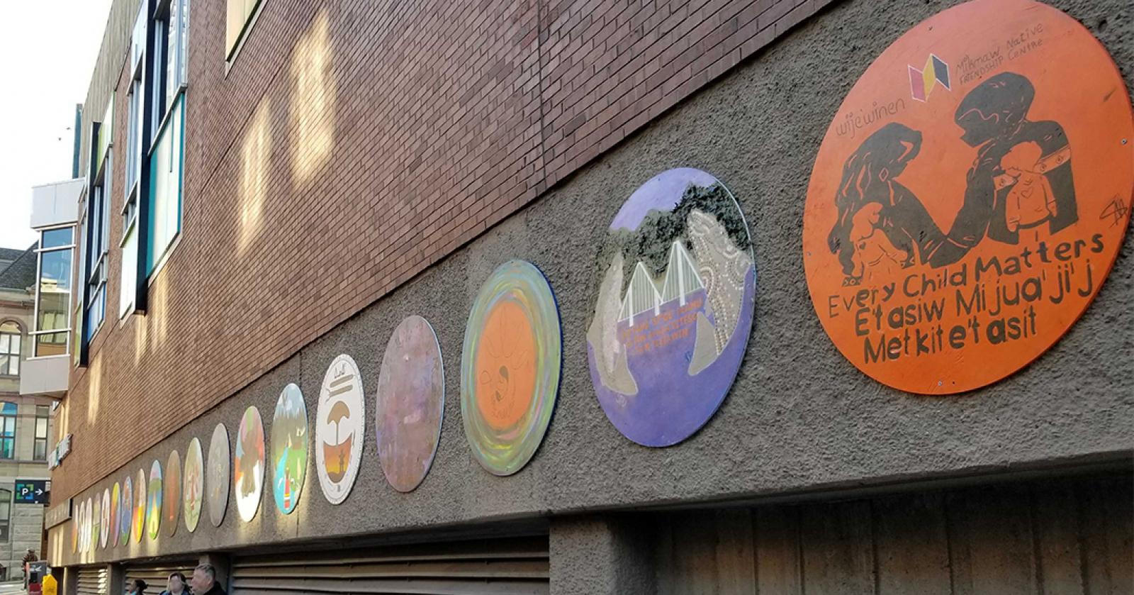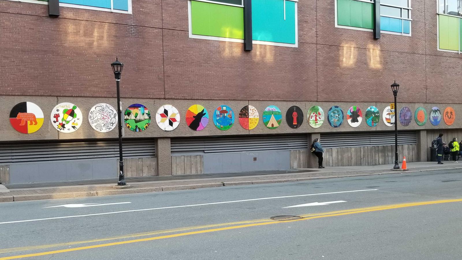 (Kjipuktuk, N.S.) - Downtown Halifax Business Commission (DHBC) is proud to announce the completion and installation of “Our Stories”, 19 circular murals created by 19 local Indigenous artists ranging between the ages of 9-55, now on display across the exterior wall of Scotia Square (facing Barrington Street.)
